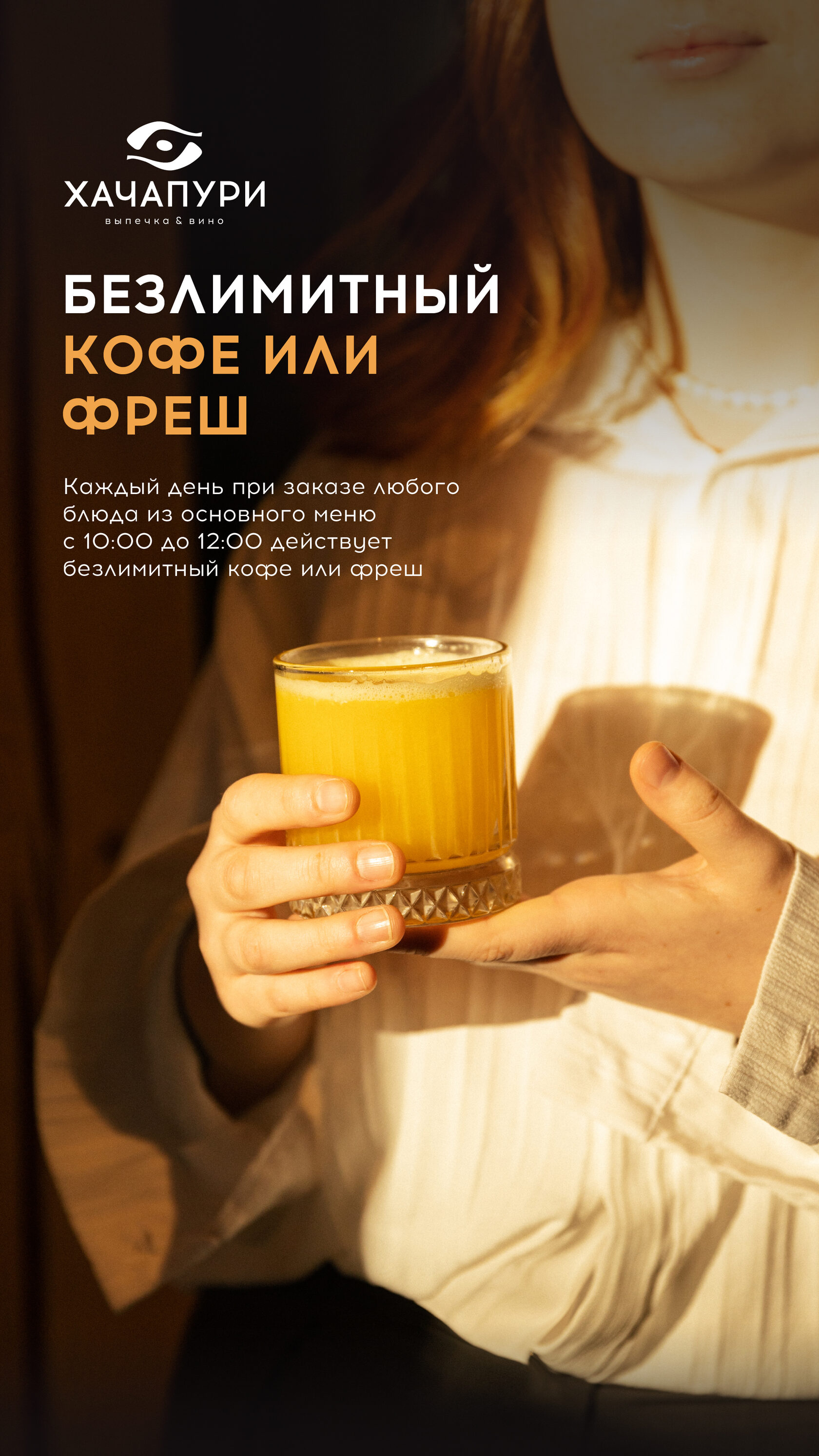 Безлимитный кофе (капучино или американо) или фреш при заказе любого блюда из основного меню с 10:00 до 12:00 кроме праздничных и предпраздничных дней.