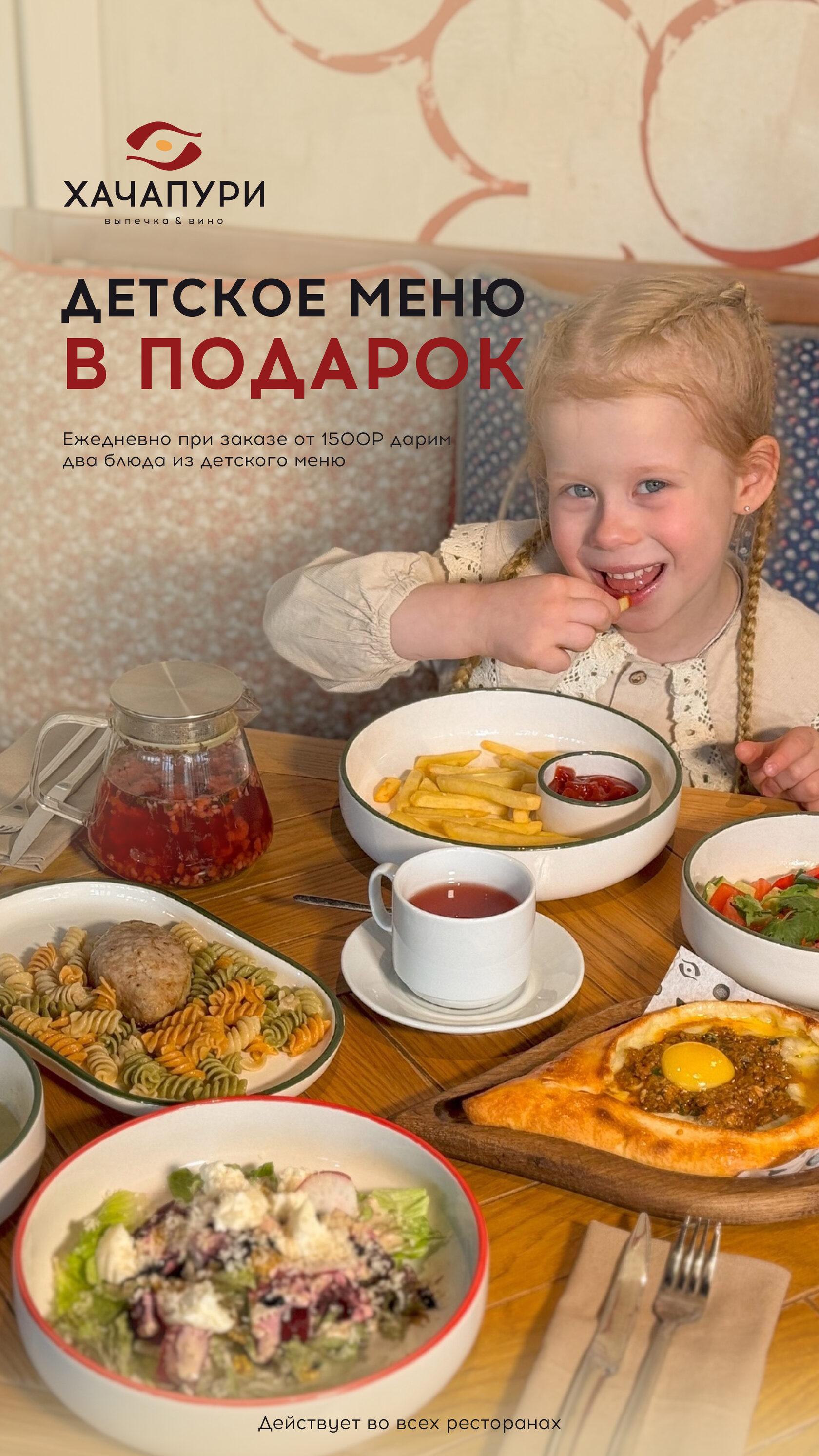 При заказе из основного меню от 1500₽ - два блюда из детского меню в подарок на каждого ребенка.